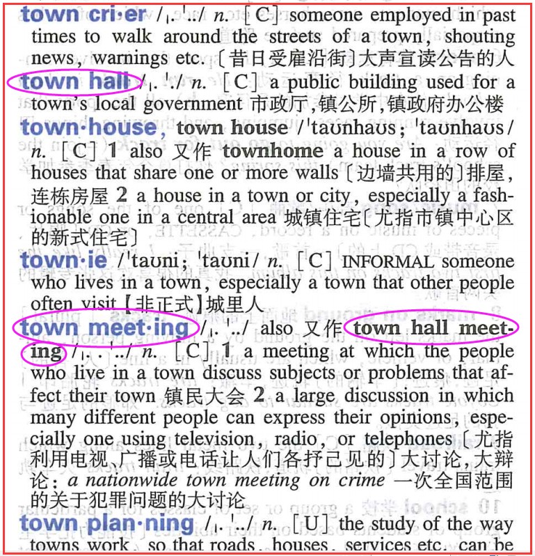 唉,英语很多时候不能瞎猜。特别是一句话概括整体意思的时候,没有上下文,只有背景知识,有时候背景知识都没有,就孤零零一句话,特别考验你的字词能力。这里的town hall 不是地点。建议奶C同学查查 town hall meeting 这个来自政界,后延伸至商界的词,你就会明白了。这也是为什么网上很多稿件都只说奥巴马在上海科技馆怎么怎么,很少有说在上海科技馆的礼堂怎么怎么的原因。以后你见到类似下图的发言情形,你就知道这就属于town hall meeting: