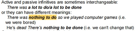 根据语法书的解释,如《朗文语法》, there be 后接不定式主动或被动都可以,可以互换。但有时在有些语境也会有区别。以你提供的例句为例:There is nothing to do. 可以表示无事可做(即无聊)There is nothing to be done. 可以表示没办法了。请看朗文的解释: