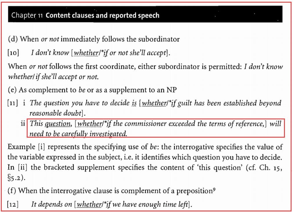 关于 if 与 whether 能否引导同位语从句,不同的书有不同的看法,有的认为引导同位语从句只能用 whether,有的认为引导同位语从句通常用 whether,但在口语中可以用 if。想听听专家老师的意见,或者最好有比较权威的出处。谢谢!