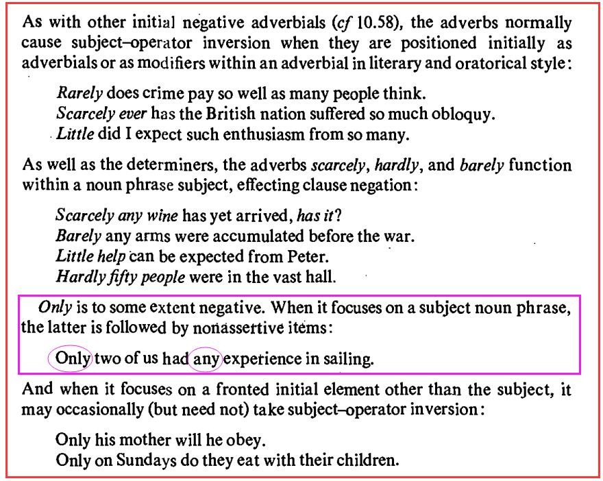 第二,only 是一个比较特殊的副词,它在某种程度上含有否定意义。许多语法著作对此都有所提及。比如 R. Quirk 在其A Comprehensive Grammar of the English Language(第10.59节)就指出:在某种程度上, only有否定的意味,当它强调用作主语的名词短语时,该名词短语后面要与非断定词项连用,请看该书的相关说明: