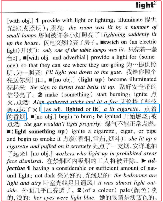 当然,韦氏惯用法词典认为lit和lighted两个形式长期并存,且类似a lit cigar这样的用法完全正当。但它既没有也不可能否定传统语法中有人(别的语法学者)认为不宜把lit用作前置定语。