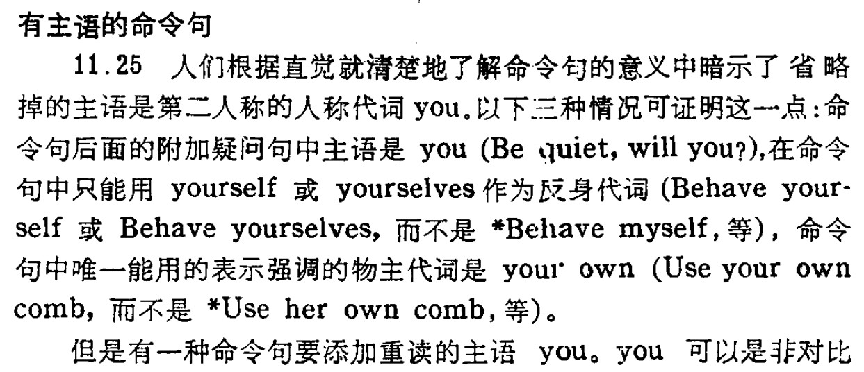 在通常情况下,祈使句的主语是第二人称 you(且通常是省略的)。但有时也可能是除 you 之外的第三人称主语(如someone, somebody, no one, nobody, everyone, everybody 等)。如: