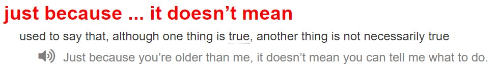 英国一个英语教学网站对此用法的解释:"Just because...doesn't mean...":We use this expression to say that there is no logical connection between two things.