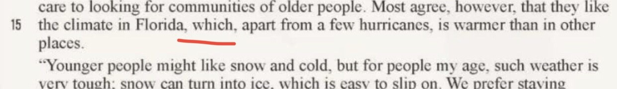 most agree=most people agree, 为主语+谓语动词,后接that从句作宾语。which为关系代词,引导非限制性定语从句修饰the climate in Florida. however 和 apart from a few hurricanes分别为插入的状语。