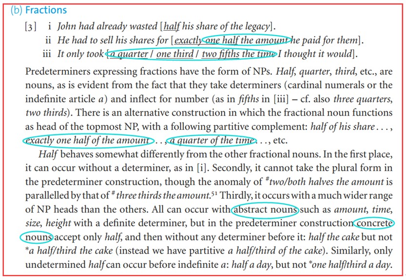 根据剑桥语法、柯林斯语法等,分数用作限定词时,其后通常只限于接抽象名词(尤其是表示数量意义的抽象名词)。如: