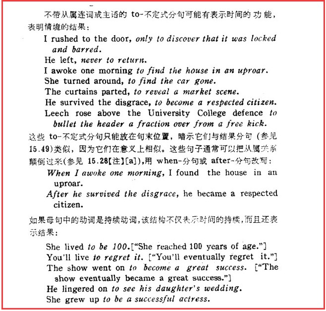 至于你提到的两种说法,也许是切入点的不同所导致的吧。比如把不定式严格限定于 to do的形式得出不能做时间状语,而如果把不定式看着是不定式词组(在 to do的形式中加上其他词,比如不定式 to be 和不定式词组 to be ninety),自然可以充当时间状语用。总之不用找权威,很多普通的原版语法资料都能找到类似解释和例句。所以个人认为,真要玩语法、琢磨语法的话,看国人“写”的语法就像使用英汉字典一样,没有太大的必要,直接看原版的吧,或者直接看母语者是如何解释的,毕竟英语不是我们的母语。个人看法,仅供参考。