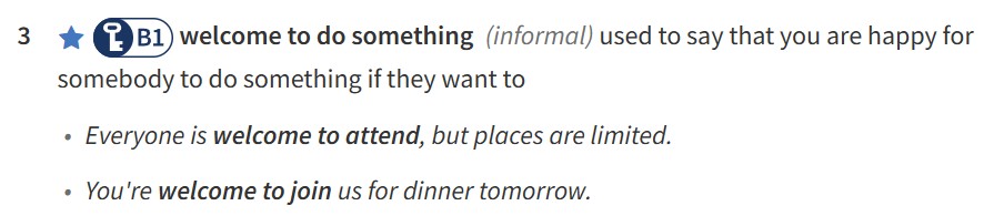 attachments-2023-05-UfrFaz0v647075d3f1538.pngattachments-2023-05-WnZsDCAb647075ea72275.png当welcome 用作形容词时,可以说 be welcome to do sth. 请看词典释义: